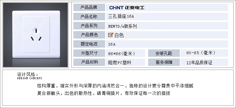 正泰电工墙壁开关插座NEW7D 大功率三级插座 空调插座 16A三孔插